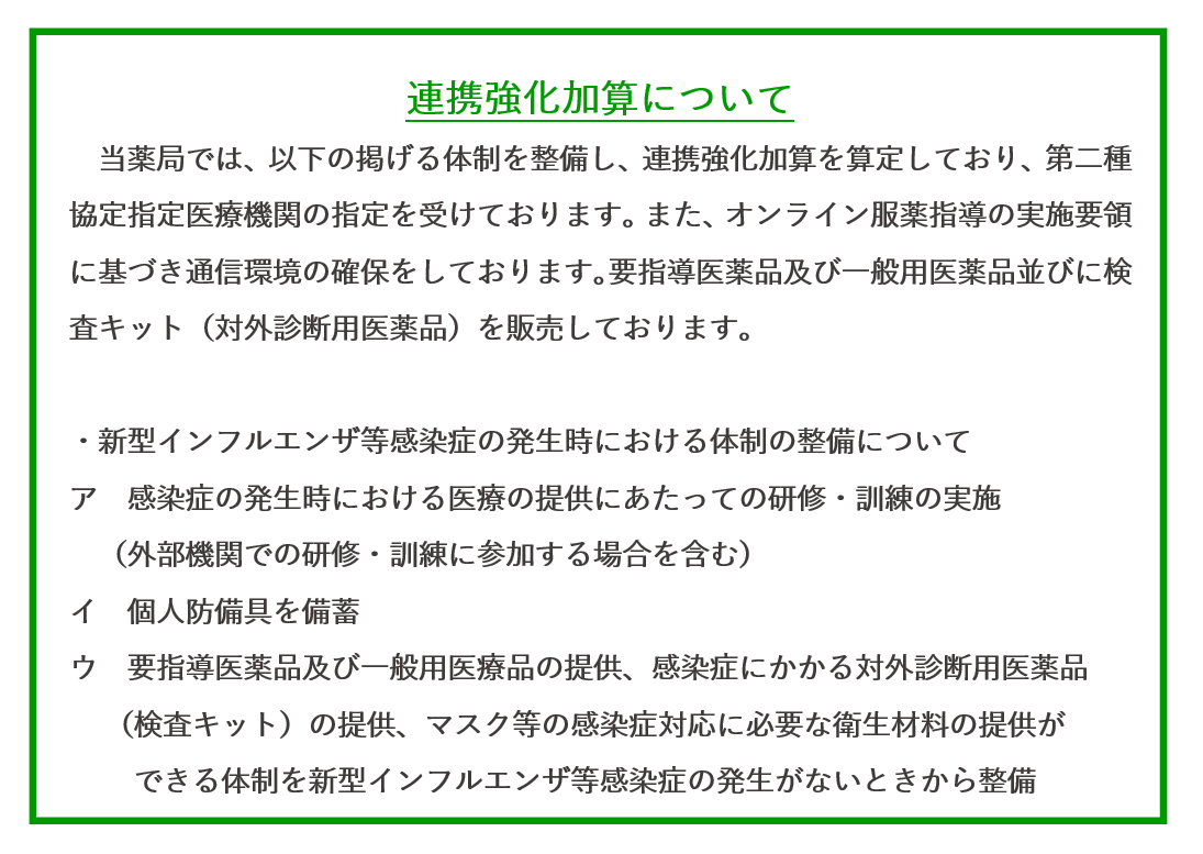 厚別通店・豊平店・新発寒こがね薬局・スイス調剤薬局(深川)では、連携強化加算を算定しております。