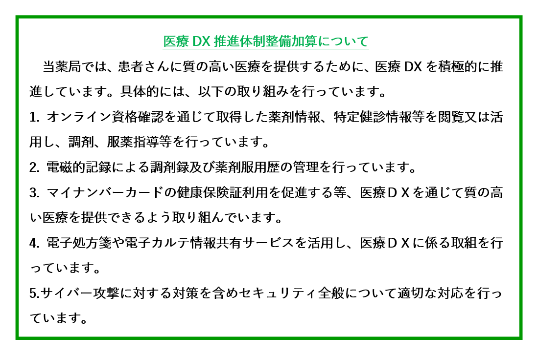 レモン調剤薬局グループでは、医療DX推進体制整備加算を算定しております。(月寒店は除く)